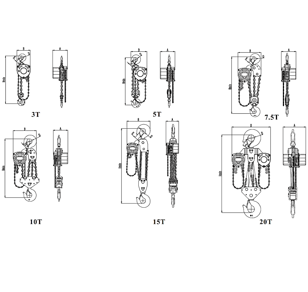 Model Kapacitet (t) Testna sila (kN) Dim. nosivog lanca (mm) Broj pada lanca Stand. visina dizanja (m) Sila za dizanje tereta (N) A (mm) B (mm) H min (mm) D (mm) K (mm) Dod. tež. po 1m lanca (kg) Neto težina (kg) Napomena Dodaj na ponudu